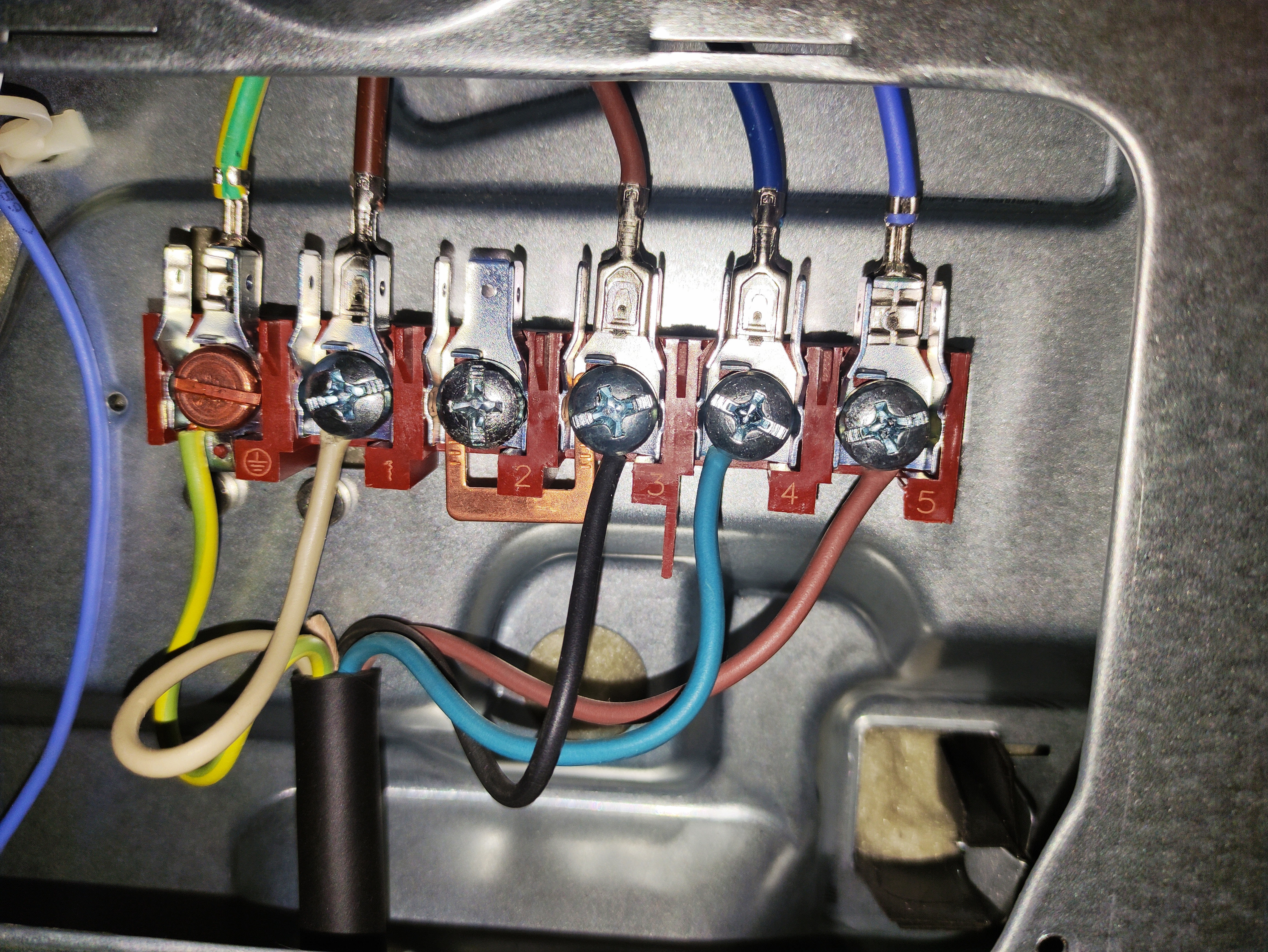 Achter op het electrische kooktoestel zit een zgn "klemmenbord" met, naast de aard aansluiting, vijf genummerde bevestigings schroeven.